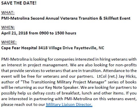 The Chapter’s Veteran Transition event hosted last year was extremely well received. Accordingly, we will host our second event on April 21, 2018 at Cape Fear Hospital, Fayetteville, NC. Veterans interested in learning more about Project Management as a career path should plan to attend as this event is open to all branches of the Military including: Active, Guard/Reserve, Veteran and Retired. We believe that the attendees will leave with the “ammo” necessary to help further transition from their current career path into Project Management. This event will also provide great networking opportunities.