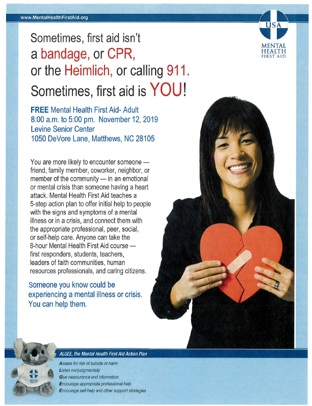 Levine Senior Center is hosting a mental health first aid training with lunch on November 12th from 8am to 5PM. There are a limited number of spots open, if interested, contact Dahn Jenkins @ dahnj@levineseniorcenter.org.