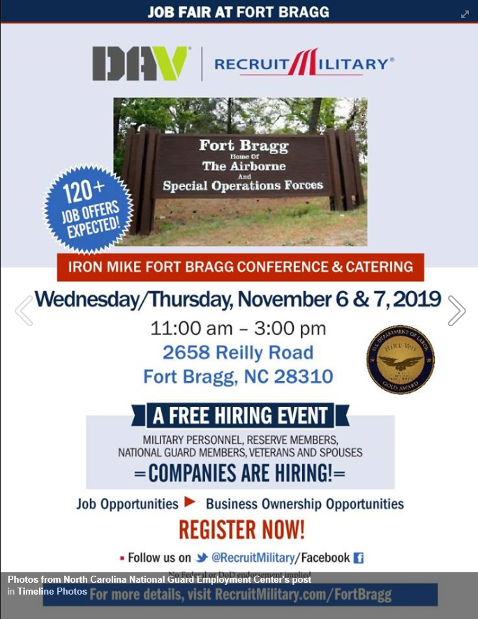 Two-Day Career Fair at Iron Mike Conference Center on Fort Bragg is free to all Transitioning Military personnel, Military Spouses, Veterans, National Guard members and Reserve members.