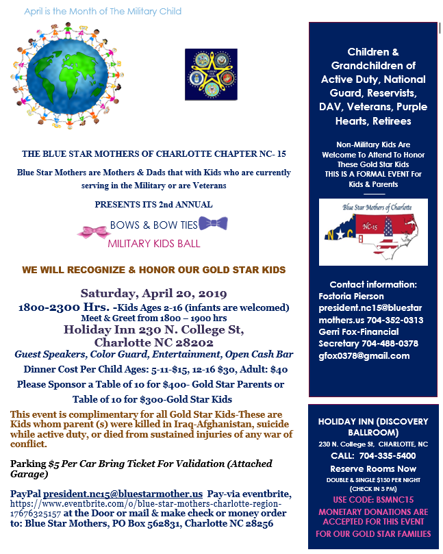 PayPal president.nc15@bluestarmother.usPay-via eventbrite, https://www.eventbrite.com/o/blue-star-mothers-charlotte-region-17676325157at the Door or mail & make check or money order to: Blue Star Mothers, PO Box 562831, Charlotte NC 28256