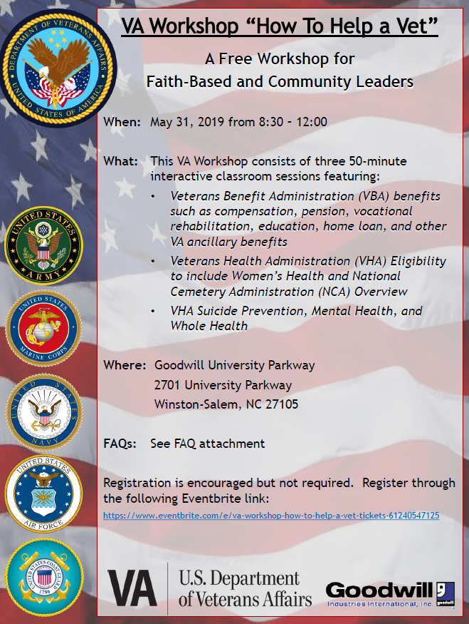 The Winston-Salem VA Regional Office is holding a free workshop for faith-based leaders, community leaders, and first responders at Goodwill University Parkway in Winston-Salem on May 31st from 8:30am to 12pm. Designed to increase awareness of available VA benefits, the workshop will consist of three 50-minute interactive sessions led by Veterans Benefits Administration, Veterans Heath Administration, and National Cemetery Administration. These sessions will provide attendees with skills to assist in identifying Veteran needs in their communities. The attached flyer provides specifics regarding each session, as well as Frequently Asked Questions.