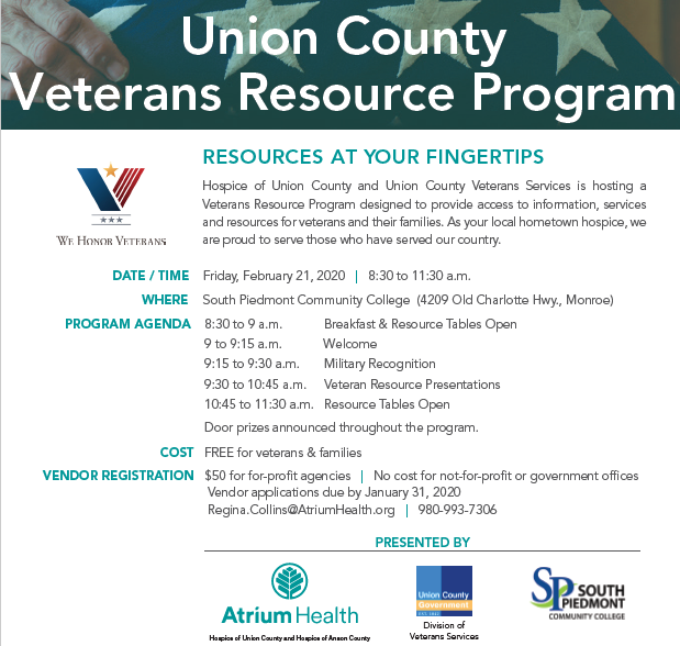 Hospice of Union County and Union County Veterans Services is hosting a Veterans Resource Program designed to provide access to information, services and resources for veterans and their families. As your local hometown hospice, we are proud to serve those who have served our country.