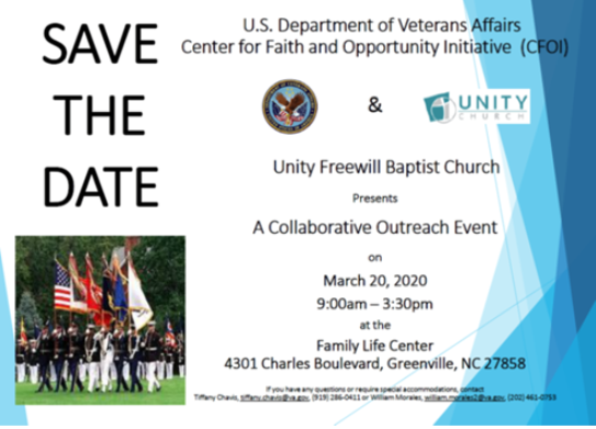 On March 20, 2020, Veterans Affairs and Unity Freewill Baptist Church have partnered up to further the progress of faith communities in preventing suicide. We invite local businesses, college representatives, professors, religious scholars, health and mental health practitioners and advocates, and family survivors of persons who had died by suicide to participate in the event. Vendors are welcome! Attached below is information on how to register as a vendor or volunteer. I am looking forward to seeing you there!